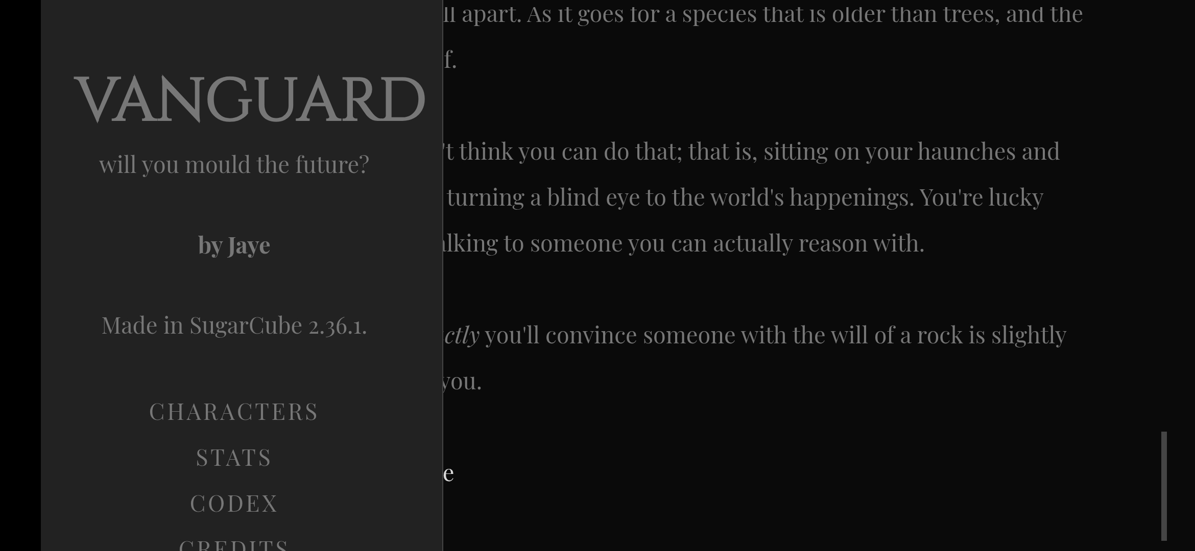 Vanguard is a high fantasy interactive fiction, driven heavily by the player character's decisions. Features a customizable playable faering character, romantic/platonic routes, and having fun as a dragon! Note: Vanguard is currently supported only on a desktop browser as of now.